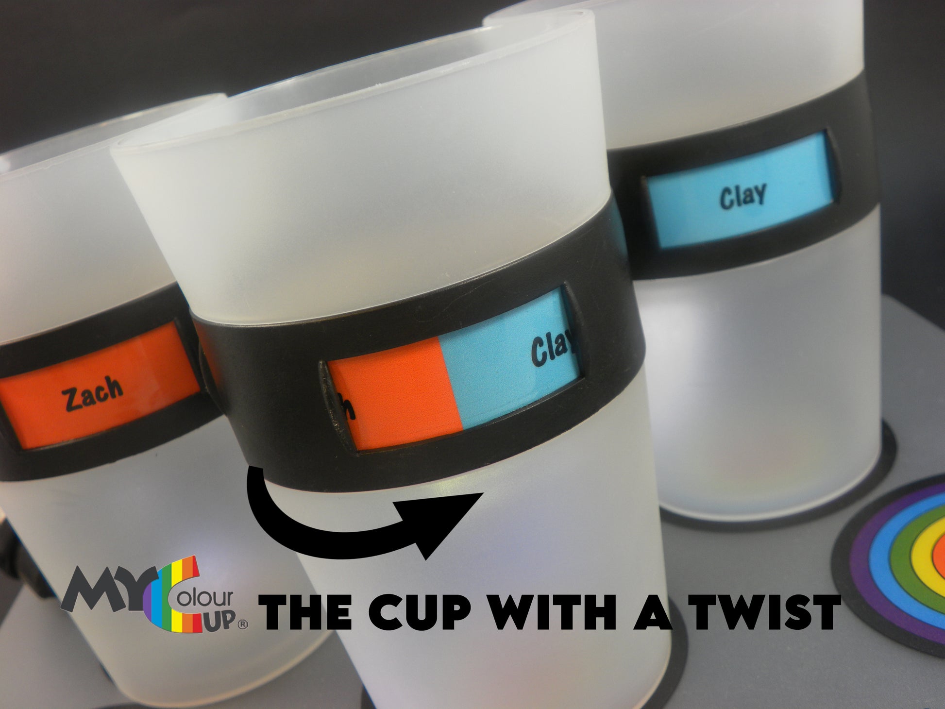 This cup has six colors that can be selected by twisting the cups band. You can personalize the colors with the names of your family and friends. These cups are a fun, easy way to keep track of all the cups in your house. MyColourCup changes names so you can easily claim your cup. No trying to find that one cup with your name on it, because all the cups can be changed to be yours.